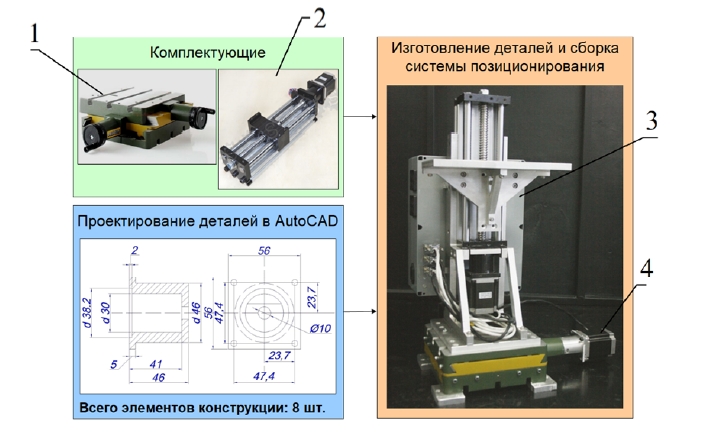 Исходная оригинальная система позиционирования ранее изготовлена на базе двухкоординатного стола с ручным приводом, модуля линейных перемещений, микроконтроллера Arduino Mega 2560, драйверов DQ542MA, шаговых двигателей 57BYGH627 и уникальных конструктивных элементов, разработанных с помощью CAD-технологий (рис. 1).