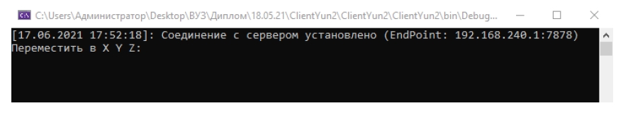 Тестирование программного управления системой позиционирования выполнялось с помощью консольного приложения, разработанного на языке С# с использованием технологии .NetCore. После запуска консоли клиентское приложение пытается установить соединение с сервером и в случае успеха получает приглашение к вводу координат новой позиции каретки (рис. 4).
