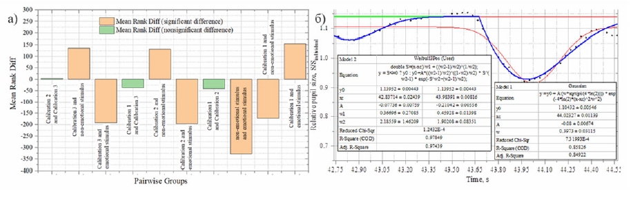 Рисунок 2 – а) результаты сравнения зрачковой реакции на разные стимулы: б) аппроксимация экспериментальных участка пупиллограммы, характеризуемый как «концентрация внимания»