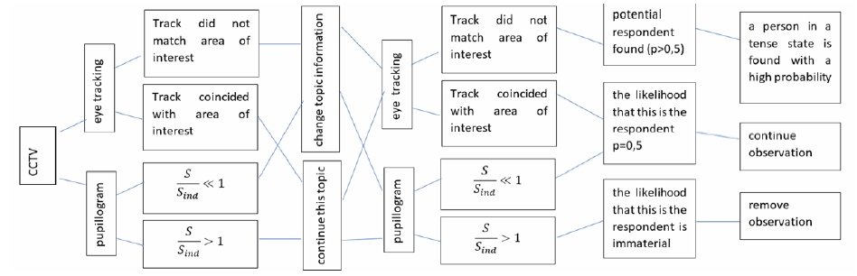Для построения алгоритма принятия решений в системах безопасности нужно применять следующий подход. На мониторе, при описанных выше условиях, демонстрируют изображения определенной тематики. В качестве стимулов могут применяться изображения, содержащие подробности, которые могут знать малый процент людей. Такие подробности обычно не вызывают интереса у несведущих. Тогда вероятность того, что область интереса и трек центров внимания совпадут не более 0,1. Ведется видеонаблюдение зрачковой реакции в ответ на полученную на информацию. Человек, который видит стимул проявляет свой интерес тем, что фокусирует взгляд на значимых элементах изображения. В зависимости от степени значимости информации, содержащейся в изображении, проявляется эмоция/ напряженность. Для таких тест-объектов дерево принятия решения можно представить в виде (рис. 4):