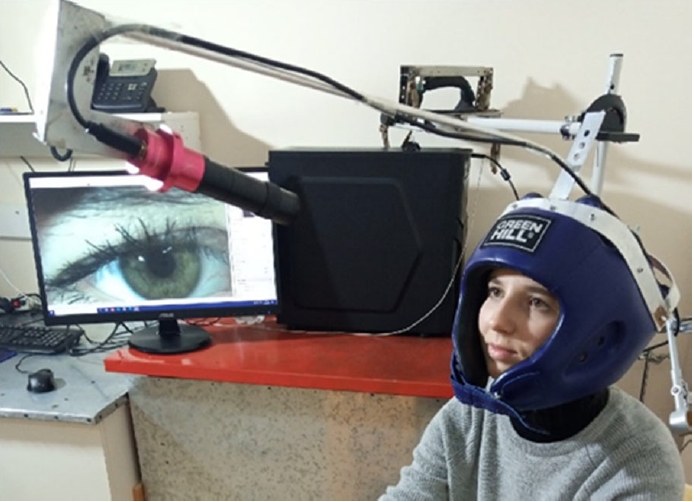 Процедура видеосъемки оптоэлектронной системой начинается с того, что испытуемый садится на стул, на него надевается специальный шлем, создающий жесткую координатную связь головы и видеокамеры. Затем испытуемый смотрит на экран телевизора (расположен на стене), с которого демонстрируется стимульный материал. При этом расстояние от стула до стены составляет не менее двух метров. Так как все испытуемые имеют разные физиологические особенности, необходимо корректировать угол наклона видеокамеры в соответствии с каждым человеком. Процедура видеосъёмки зрачка длится не более 10 минут.