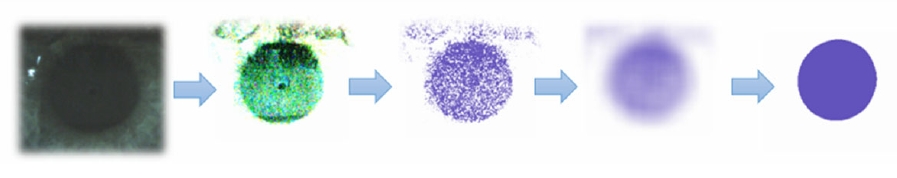 Проблема точного выделения зрачка связана с оконтуриванием. Во многих случаях очень важно выделить зрачок, отследить его размеры и трек. Для оконтуривания зрачков существуют различные методы. Можно назвать морфологическое выделение круга, проекции яркости или ее градиента, построение оптимального контура. Мы для препарирования изображений, обработки и оконтуривания зрачков используем программу FiJi. Процесс обработки представлен на рис. 3.