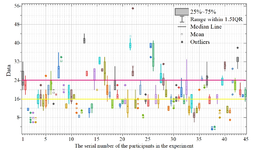 Подтверждением того, что человек находится в напряженном состоянии, является превышение ситуативного показателя над индивидуально-типологическим сверх нормы. В отличие от индивидуально-типологического показателя психического состояния ситуативный показатель отражает психическое состояние человека в конкретной ситуации. На рис. 4 отмечены два уровня психоэмоционального состояния, соответствующие стандартизированным показателям по диагностической шкале психоэмоциональных состояний [7]: красная линия – уровень «чрезмерно», желтая линия – уровень «выше среднего».