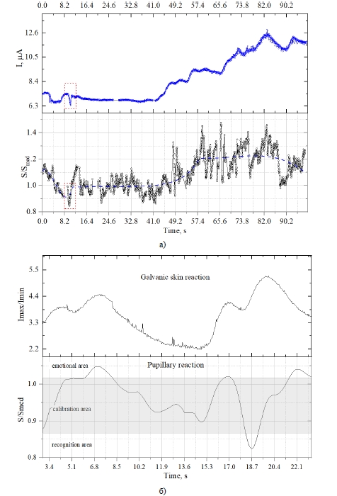 Рисунок 5 – а) Пупиллограмма и КГР с сильным эмоциональным откликом; б) Пупиллограмма и КГР со слабым эмоциональным откликом